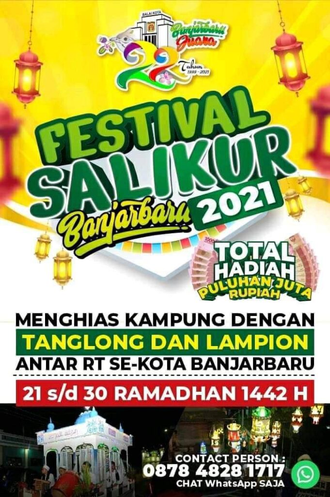 Ayuu Umpatan sa-Banjarbaruan… Dalam rangka menyemarakkan bulan Ramadhan, Banjarbaru akan melaksanakan Festival Salikur 2021. MENGHIAS KAMPUNG DENGAN TANGLONG DAN LAMPION ANTAR RT SE-KOTA BANJARBARU. Nang handak umpat atau handak betatakunan soal acara, silakan menghubungi nomor WA yang tertera; 0878 4828 1717. Ayuu Umpatan sa-Banjarbaruan… Jangan Sampai Katinggalan…